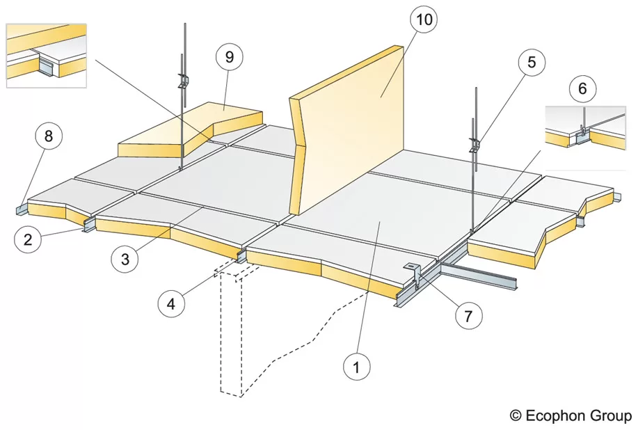 Ecophon Combison Duo E là hệ thống trần tiêu âm có thiết kế âm xương với các tấm trần được thiết kế cạnh vát tạo nên hiệu ứng bóng ấn tượng. Sản phẩm được sử dụng cho các không gian yêu cầu hệ thống trần treo hút âm và cách âm giữa các phòng nếu vách ngăn không mở rộng đến sát trần. Sản phẩm cũng phù hợp cho không gian yêu cầu giảm độ ồn theo phương thẳng đứng.