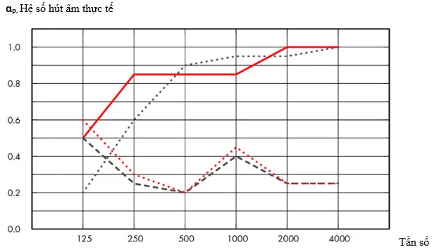 Kết quả kiểm tra theo tiêu chuẩn EN ISO 354. Phân loại cấp độ theo tiêu chuẩn EN ISO 11654 và giá trị đơn lẻ cho hệ số suy giảm tiếng ồn NRC và hệ số hút âm trung bình SAA theo tiêu chuẩn ASTM C 423.